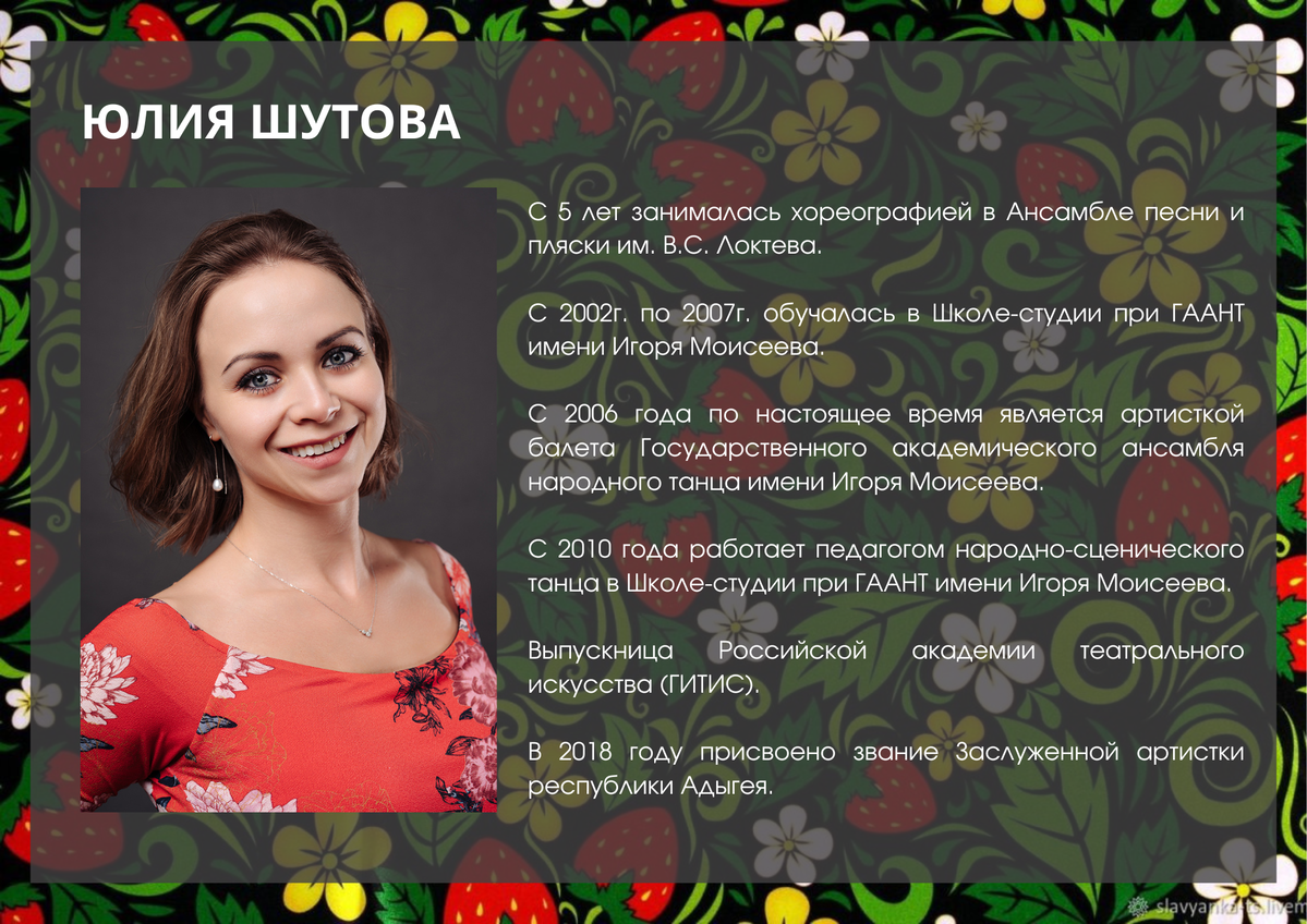 Выпускница аспирантуры Академии Русского балета имени А.Я. Вагановой.