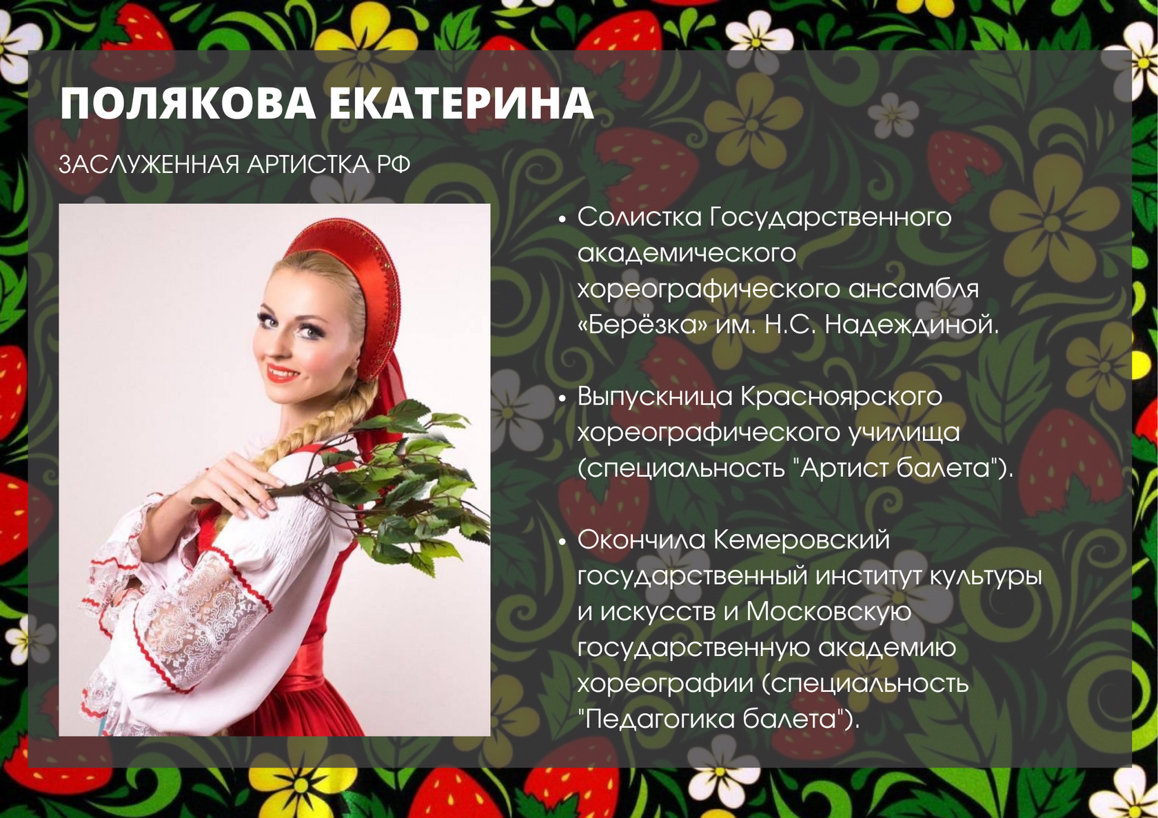 Выпускница аспирантуры Академии Русского балета имени А.Я. Вагановой.