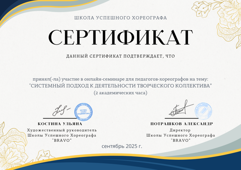 Сертификат участника для педагогов-хореографов "Главный секрет 2025". 2 день